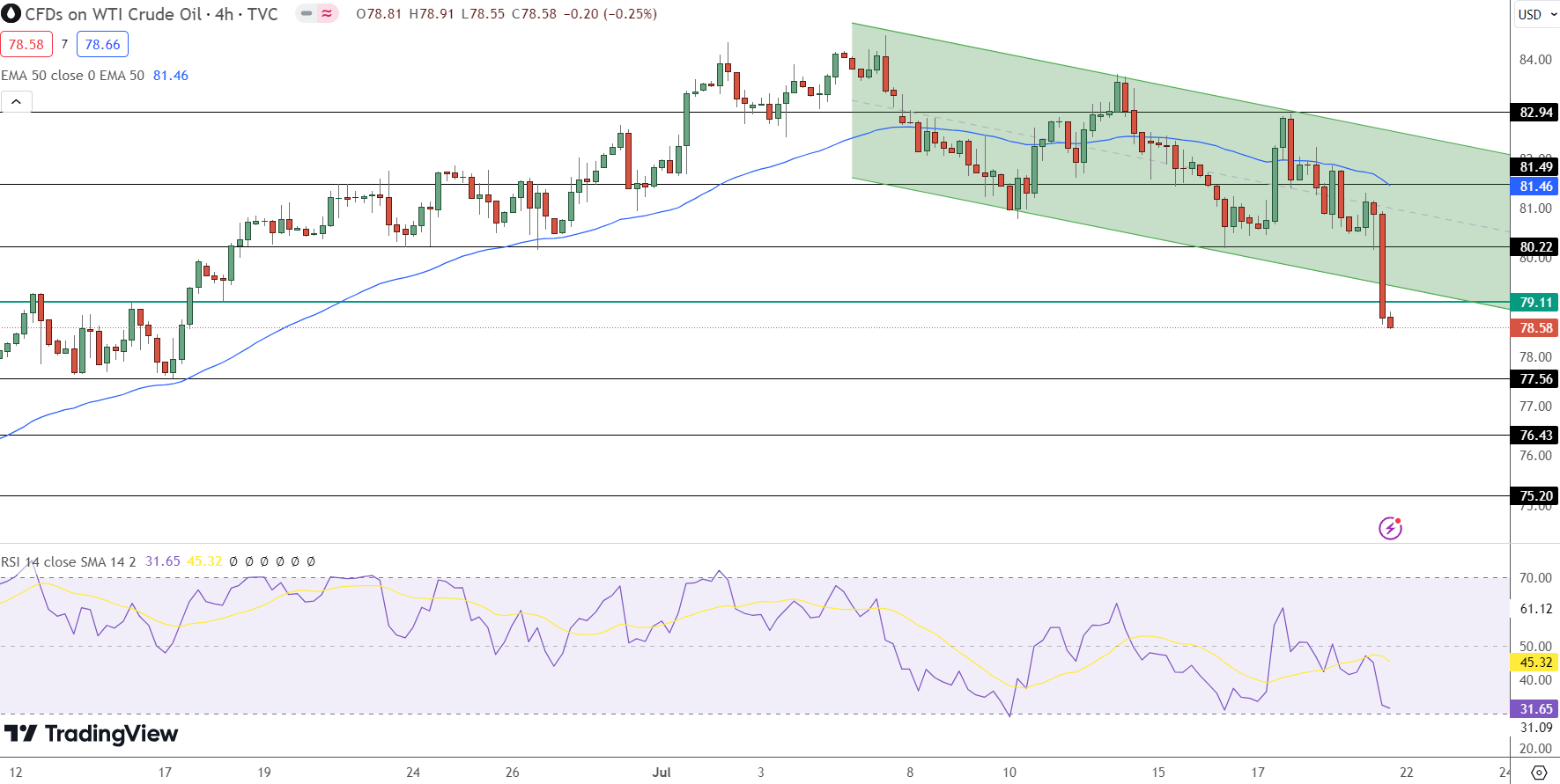 The downward trend channel observed provides support near the $79.10 level. A breach below this support could push USOIL prices toward the next support area around $77.56, extending down to $76.43 if the downward momentum continues.