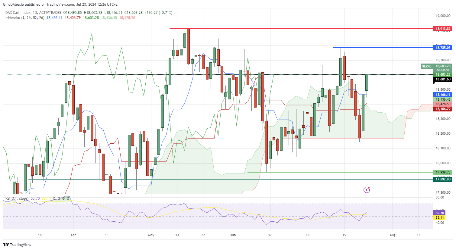 To the downside, immediate support is on the top of the cloud at around 18,355, and further support would be on the bottom of the cloud at 18,170. For a confirmation of a bull trend we would need to see the market break above the previous all-time high of 18,913 (red line).