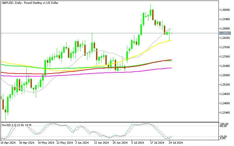The GBP/USD pair broke above 1.30 in early July, but an inverted hammer candlestick on the weekly chart this week indicated a potential bearish reversal. The price has since fallen by approximately 2 cents from its peak, suggesting that the bullish breakout might have been a false move. However, the decline paused around the 50-day SMA (yellow) today. The CBI Realized Sales for June reported a -43k decline, compared to the expected -20k, adding to the bearish sentiment in this forex pair. Nonetheless, there could be a “buy-the-fact” scenario, where the GBP might see a relief rally if the Bank of England (BOE) decides not to cut rates.