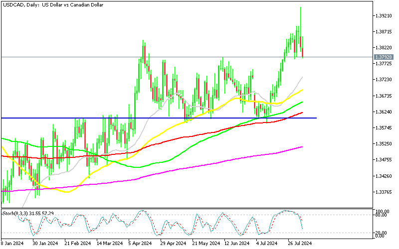 The volatility in the CAD to USD rate has increased in recent weeks. For about two months, USDCAD was confined within a narrow 2-cent range. However, in July, it embarked on a bullish trend, rising from just below 1.36 to 1.3946. This surge was influenced by the Bank of Canada’s dovish rate cut. Despite the US dollar losing value against most major currencies, the Canadian dollar has also been weakened due to a recent shift towards negative risk sentiment, fueling the upward movement until yesterday.