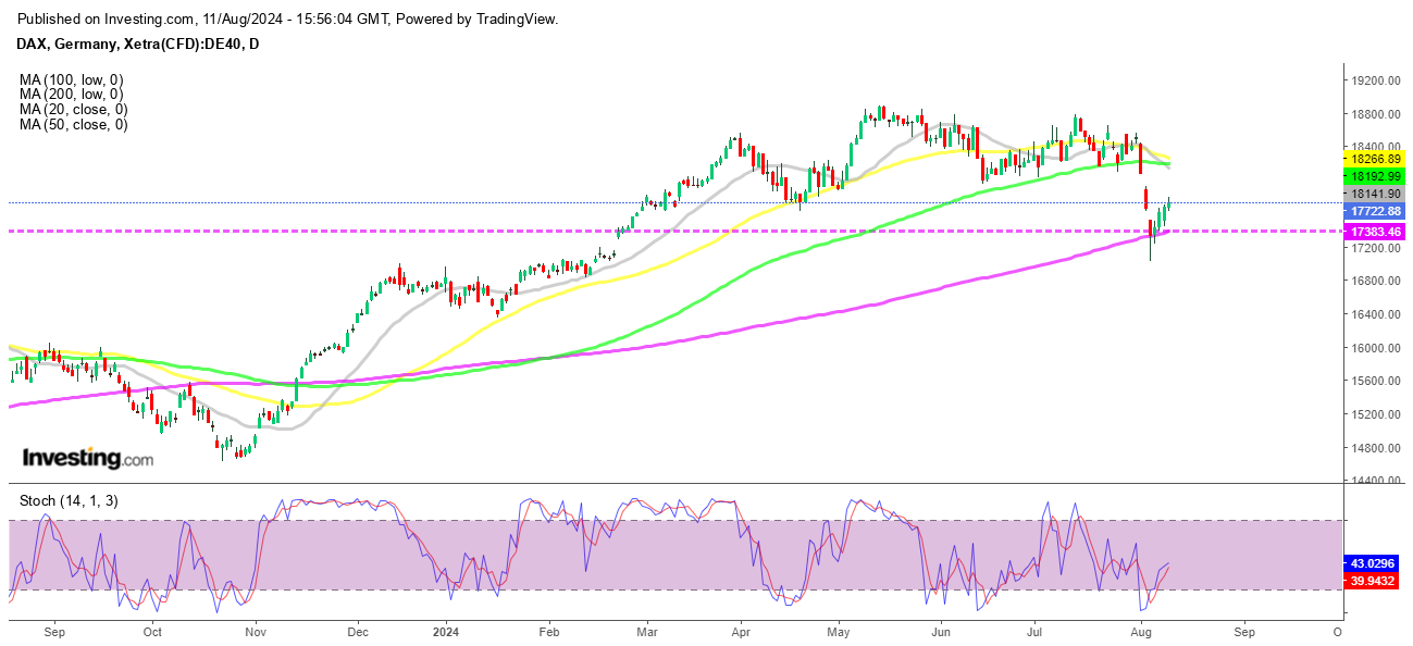 The Nikkei took a staggering 12% dive, while the DAX 30 tumbled to 17,000 points. However, the downward spiral halted during the US session on Monday, and the markets resumed their bullish trend. The DAX 30, after briefly dipping below the 200-day SMA (purple), rebounded and ended the day above it. The remainder of the week saw a return to optimism, with the DAX closing higher on Friday, driven by gains in the telecom, food and beverage, and financial services sectors.