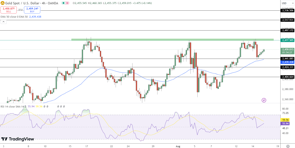Immediate resistance is at $2,477.21, with further hurdles at $2,496.82 and $2,515.33. A break above these levels could signal a stronger upward move.