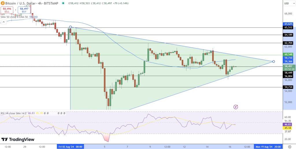 On the downside, support lies at $58,449, with additional levels at $56,804 and $54,734. A break above $60,548 could trigger a bullish move, while a decline below $58,449 may lead to further downside pressure.