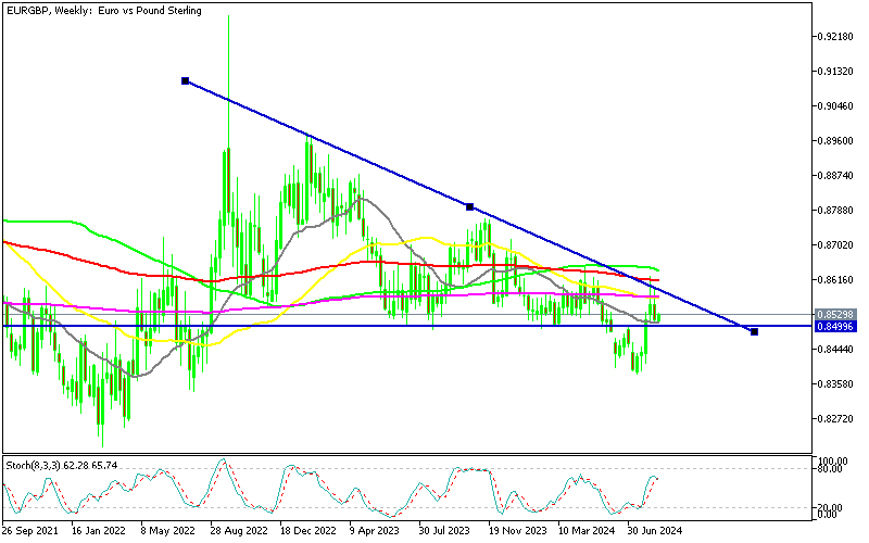 EURGBP bounced in late July, pushing above 0.85, but the trendline continues to hold, rejecting the price, as the highs get lower. The EUR/GBP currency pair maintained stability above 0.85 during Q1, which has served as a crucial support level since June 2023. Despite this, the weekly chart continued to show declining highs, indicating persistent downward pressure.