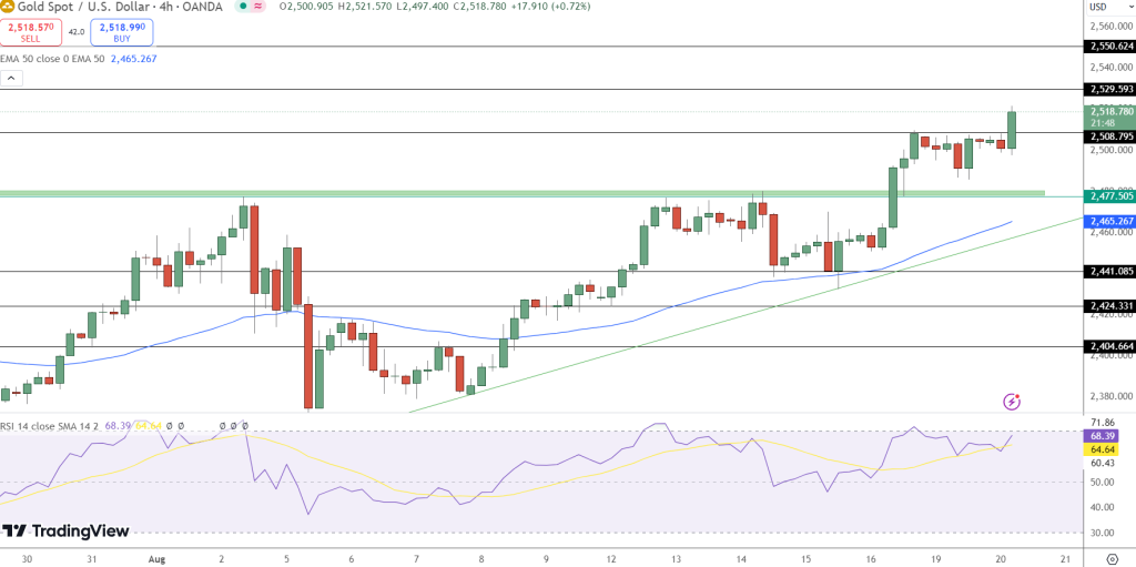 Immediate resistance is found at $2,524.11, with further resistance levels at $2,540.75 and $2,556.71. On the downside, support is seen at $2,491.41, with additional support at $2,480.08 and $2,461.80.