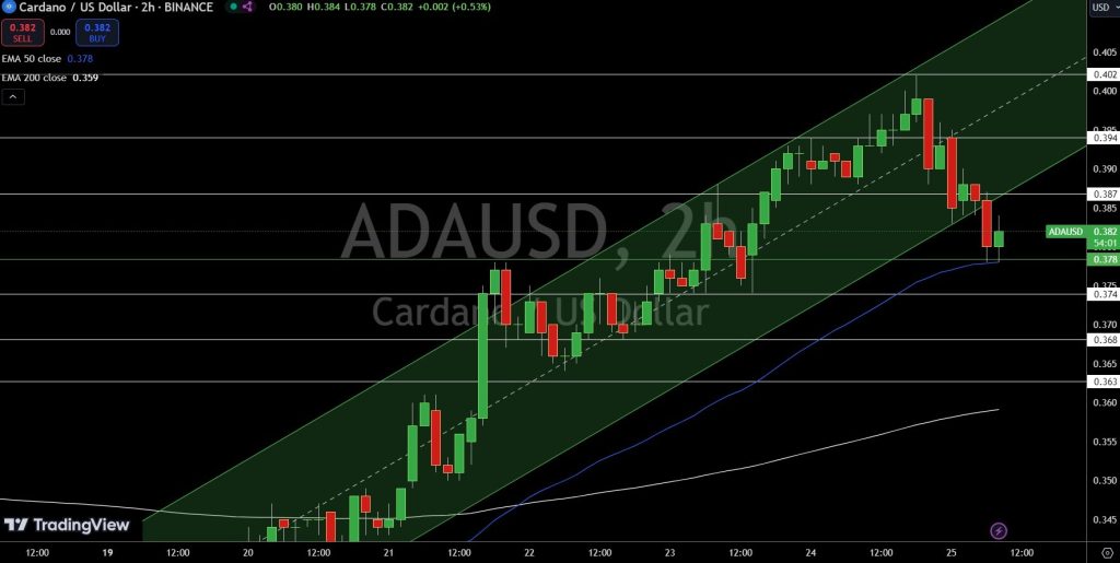 Currently trading within a well-defined upward channel, ADA is holding steady above the 50-day Exponential Moving Average (EMA) at $0.378.
