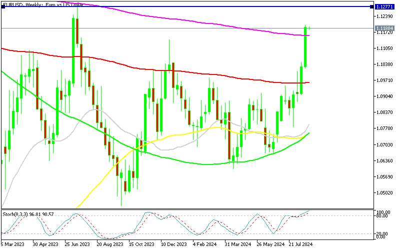 Last week, the pair climbed to 1.1201, breaking through the 200-week SMA, which had served as resistance in July 2023, and surpassing the December 2023 high of 1.1140, despite signs of a weakening Eurozone economy, as indicated by last week’s PMI surveys. Now, the pair is facing last year’s high of 1.1275, and it remains to be seen if buyers can reach and sustain this level.