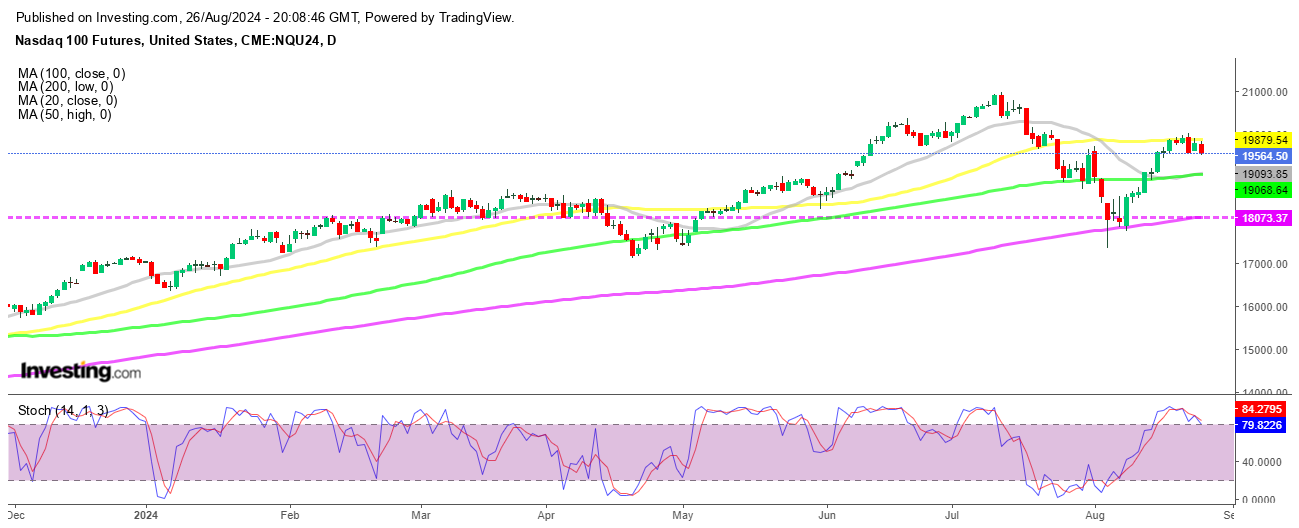 Recently, the general market trend has been characterized by a weaker dollar and stronger stocks, driven by expectations that the Federal Reserve (Fed) will soon begin lowering interest rates. Despite this positive sentiment, buyers have struggled to break through the 50 SMA and the 20,000 point mark. Today, the Nasdaq experienced a bearish reversal, closing with a 1.5% loss. Although the Nasdaq opened higher, it quickly reversed course and remained stagnant for most of the day. Small-cap stocks initially rose but lost momentum, while the tech sector slumped amid growing concerns about Nvidia’s upcoming earnings announcement on Wednesday. In contrast, the Dow Jones closed at a fresh record high.