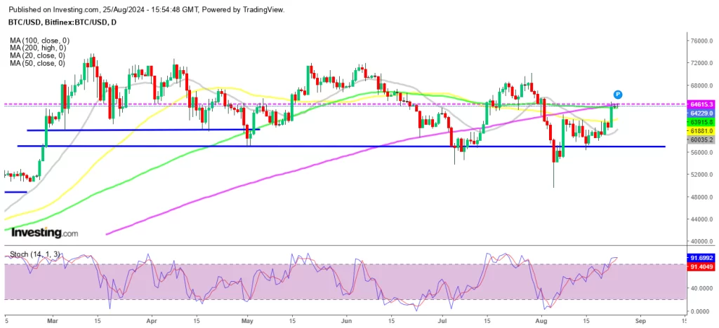 After the crash in early August, Bitcoin is back up, with buyers pushing up in steps, first to $62,000 and in the last few days, closer to $65,000. However, BTC buyers are facing a couple of moving averages which are acting as the last resistance indicators before they push the price to $70k.