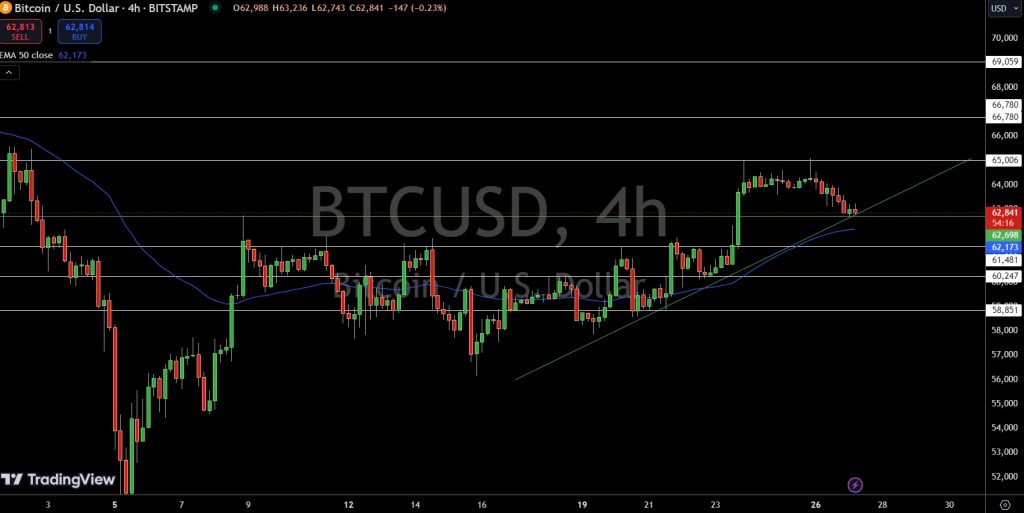 This level is especially significant as it coincides with an upward trendline, attracting additional buying interest. The 50-day Exponential Moving Average (EMA) at $62,100 further strengthens this support zone.