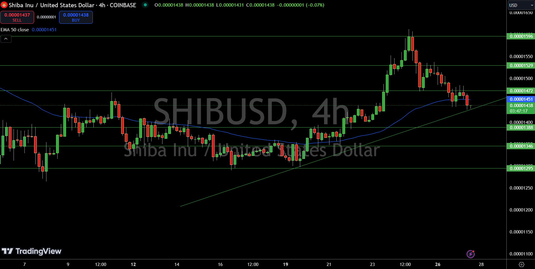 Following yesterday’s price surge, SHIB is once again challenging this crucial resistance level, with today’s session seeing highs of $0.00001533.