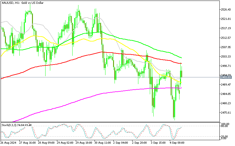 Gold dropped to a low of $2,470 yesterday, testing a significant support and resistance zone. It retested that level today, rallying for a second time, driven by heightened geopolitical tensions in the Middle East and growing expectations of a 50 basis point rate cut by the Federal Reserve due to weak job growth figures. However, a stronger US dollar has restricted gold’s upward momentum, keeping it below key resistance levels. On the H4 chart, we initiated a sell trade at the 50 SMA (yellow), anticipating a continuation of the bearish trend that started last week. While the trade was on track, a move above the 50 SMA, triggered by weak US job data, disrupted our plan. Still, the upward move faced resistance at the 100 SMA (red), and the price is now reversing. We are maintaining our sell position as the pattern of lower highs suggests the short-term trend remains bearish.