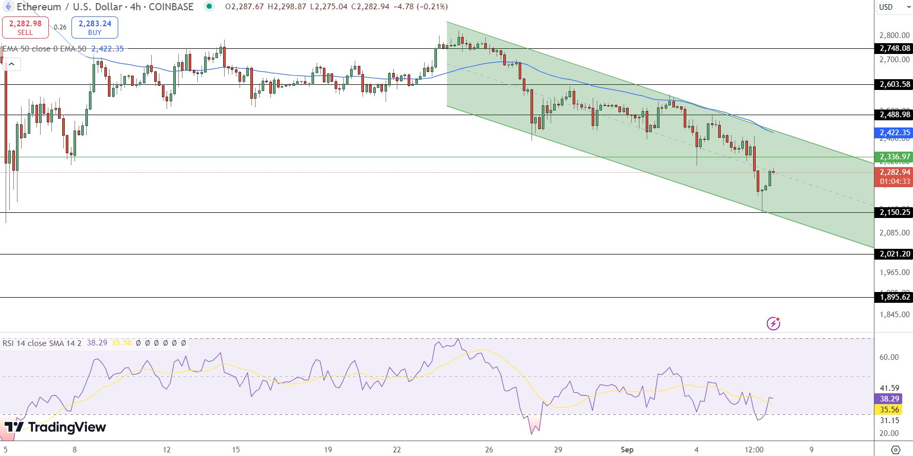 - RSI and 50-day EMA: The Relative Strength Index (RSI) currently sits at 38, indicating weak momentum. Additionally, the 50-day Exponential Moving Average (EMA) is at $2,422, presenting a significant barrier that Ethereum needs to overcome for a sustained rally.