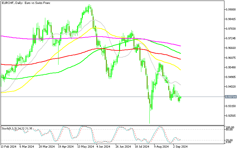 EURCHF was bullish for more than a year until May, almost reaching parity, but it made a bearish reversal and fell to 0.92 by early August.
