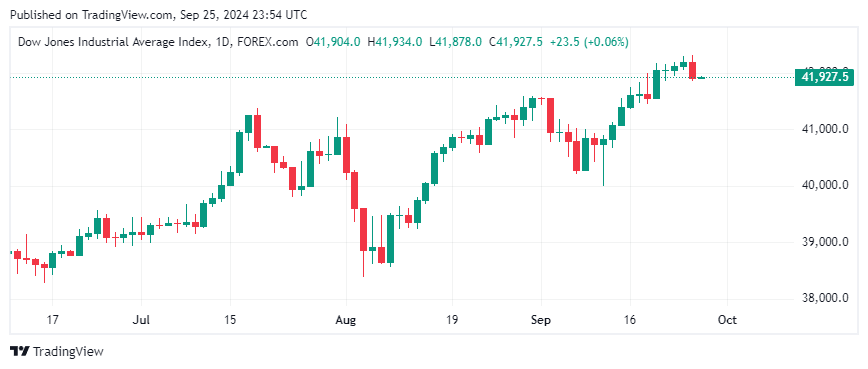 - Dow Jones Drops: The Dow ended its four-day record streak, closing down -293.47 points at 41,914.75.