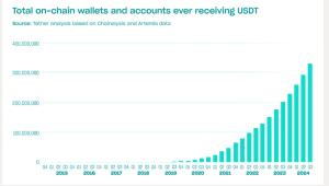 330 million on-chain wallets interacted with USDT in the third quarter, indicating high cryptocurrency adoption. That number is equal to the population of the United States! Furthermore, our partners estimate that several tens of millions more USDT users exclusively use centralized systems.