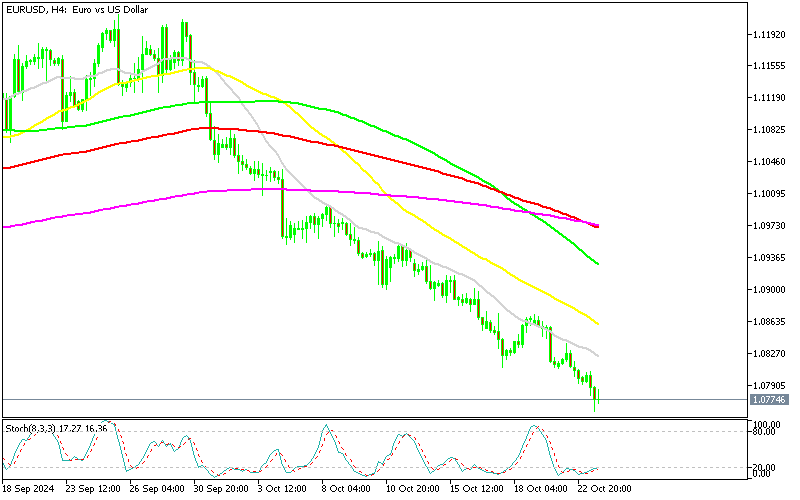 The EUR/USD currency pair has struggled to rise above the 1.08 mark. Although intraday traders tried to manage the correction, sellers continued to apply pressure, keeping the exchange rate below this key level. Dovish comments from the European Central Bank (ECB) have contributed to this weakness, causing the pair to fall below the 200-week SMA. With strong demand for the U.S. dollar, sellers are now pushing for the 1.07 level as the next target for EUR/USD.