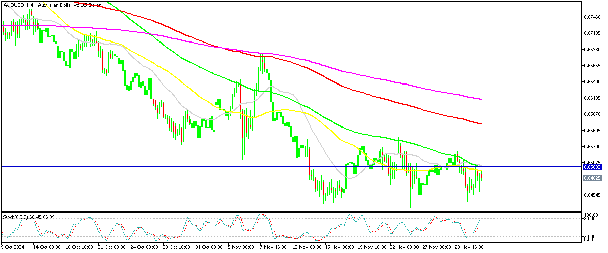 AUDUSD has been bearish since October, but it has been consolidating around the 0.65 level after breaking it, awaiting the Q3 GDP report from Australia, which showed a slowdown.