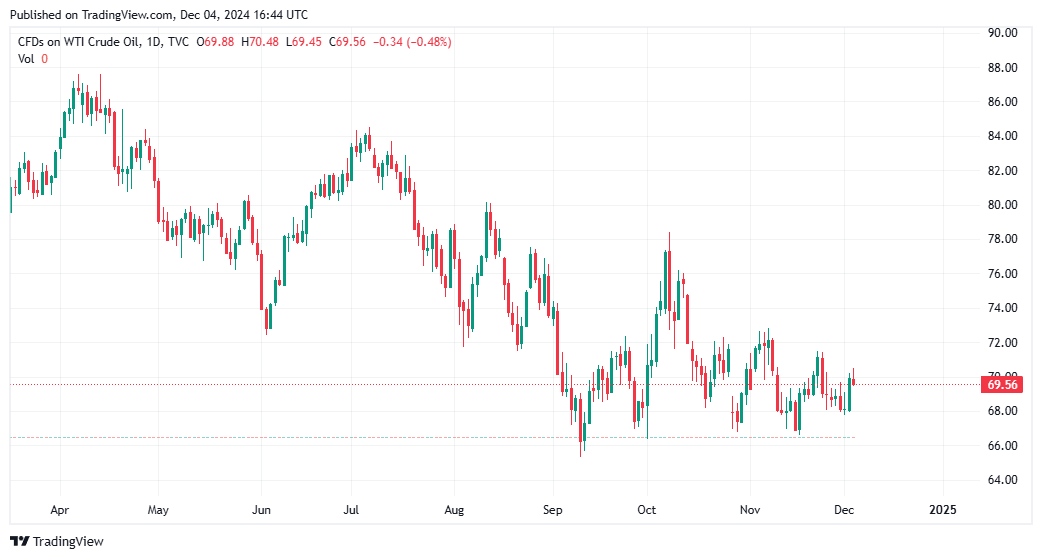 Oil prices have been struggling to maintain levels above $70, despite various factors influencing the market. Last week, crude briefly climbed past $71 but WTI crude quickly fell back below $70 after the ceasefire between Israel and Lebanon diminished the geopolitical risk premium. This drop erased a 3% gain, reflecting the market’s bearish sentiment. Even with significant inventory drawdowns reported by the EIA, buyers have failed to sustain gains above the $70 level.