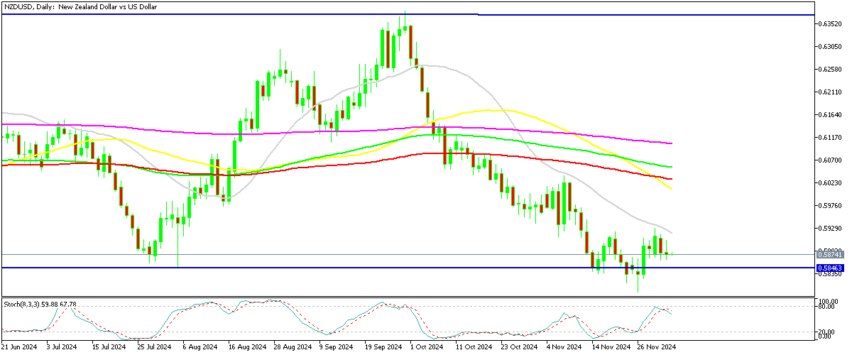 The NZD/USD pair experienced a temporary rebound above 0.59 following the Reserve Bank of New Zealand’s (RBNZ) decision to cut interest rates by 50 basis points. This recovery came after the pair had fallen nearly 6 cents over the past two months, driven by the persistent strength of the US dollar. Despite the initial rally, NZD/USD remains trapped in a broader bearish trend, as the rebound failed to gain traction.