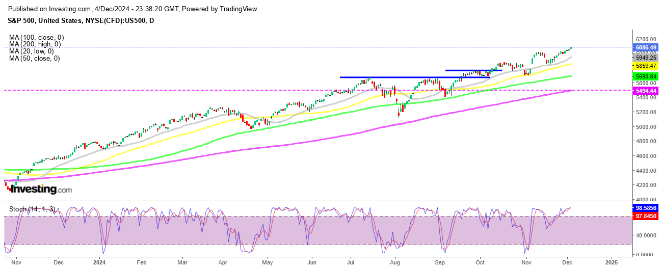 Earlier, FED's Jerome Powell sounded optimistic about the US economy, which means fewer rate cuts, helping the S&P 500 approach 6,100 points
