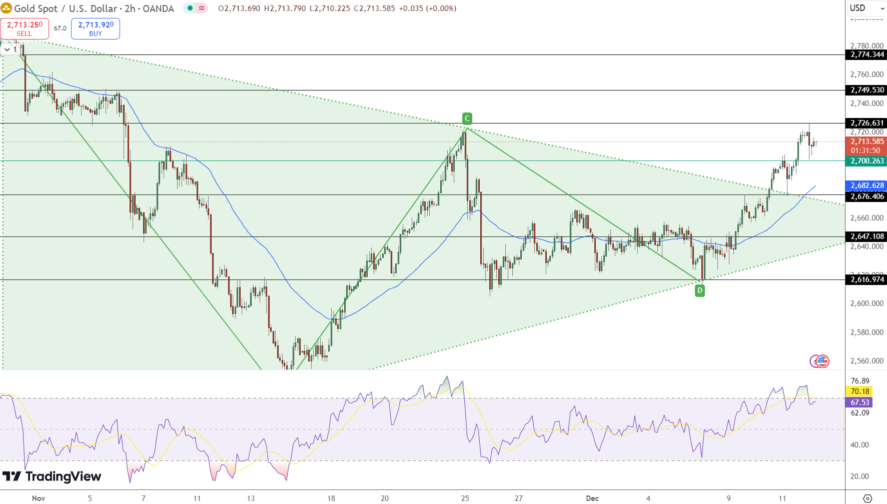 Gold remains in a bullish zone, trading at $2,715 after breaking a symmetrical triangle pattern on the 2-hour chart. Immediate resistance levels are seen at $2,727 and $2,750, with a potential surge to $2,775 if momentum continues. On the downside, critical support levels are identified at $2,700 and $2,683 (50-day EMA).