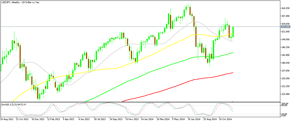 After a strong two-month rally where the USD/JPY gained over 17 cents, the pair experienced a sharp decline in the final week of November. This selloff intensified during the US Thanksgiving week, driving the pair down by 7 cents and below the critical 150 level. However, support from the weekly chart’s 20 SMA (gray) halted the decline.
