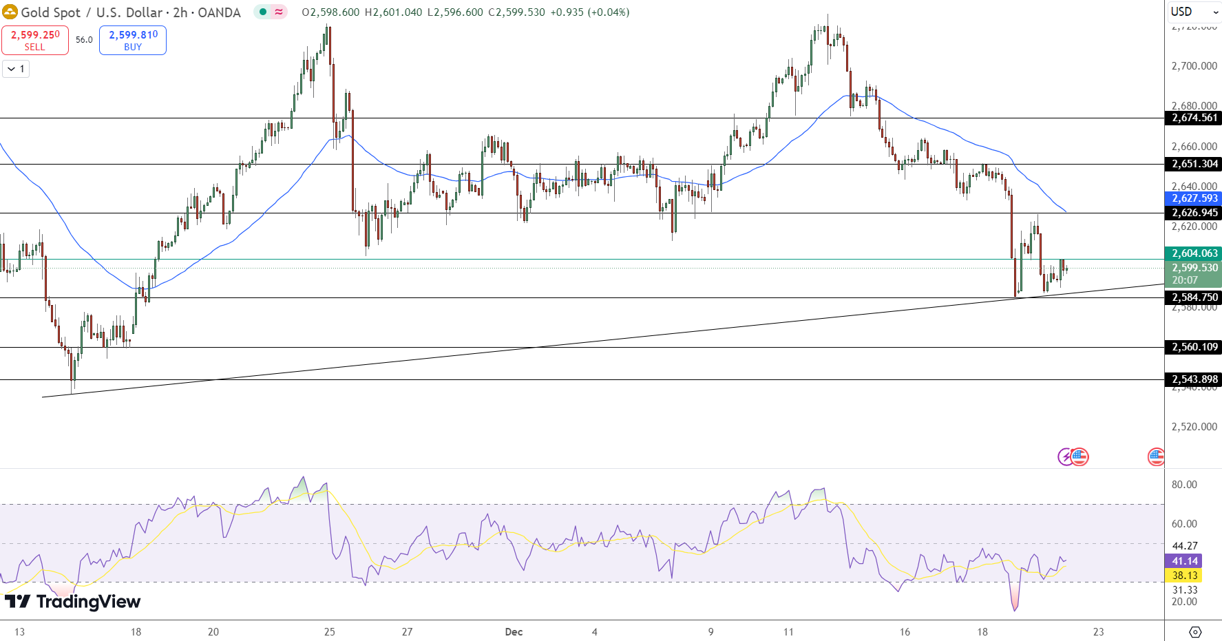 Gold is trading near $2,599.53, consolidating around the $2,604.06 pivot point. On the 2-hour chart, gold is attempting to form an ascending trendline, but bearish sentiment remains dominant as the metal stays below its 50 EMA at $2,626.94.