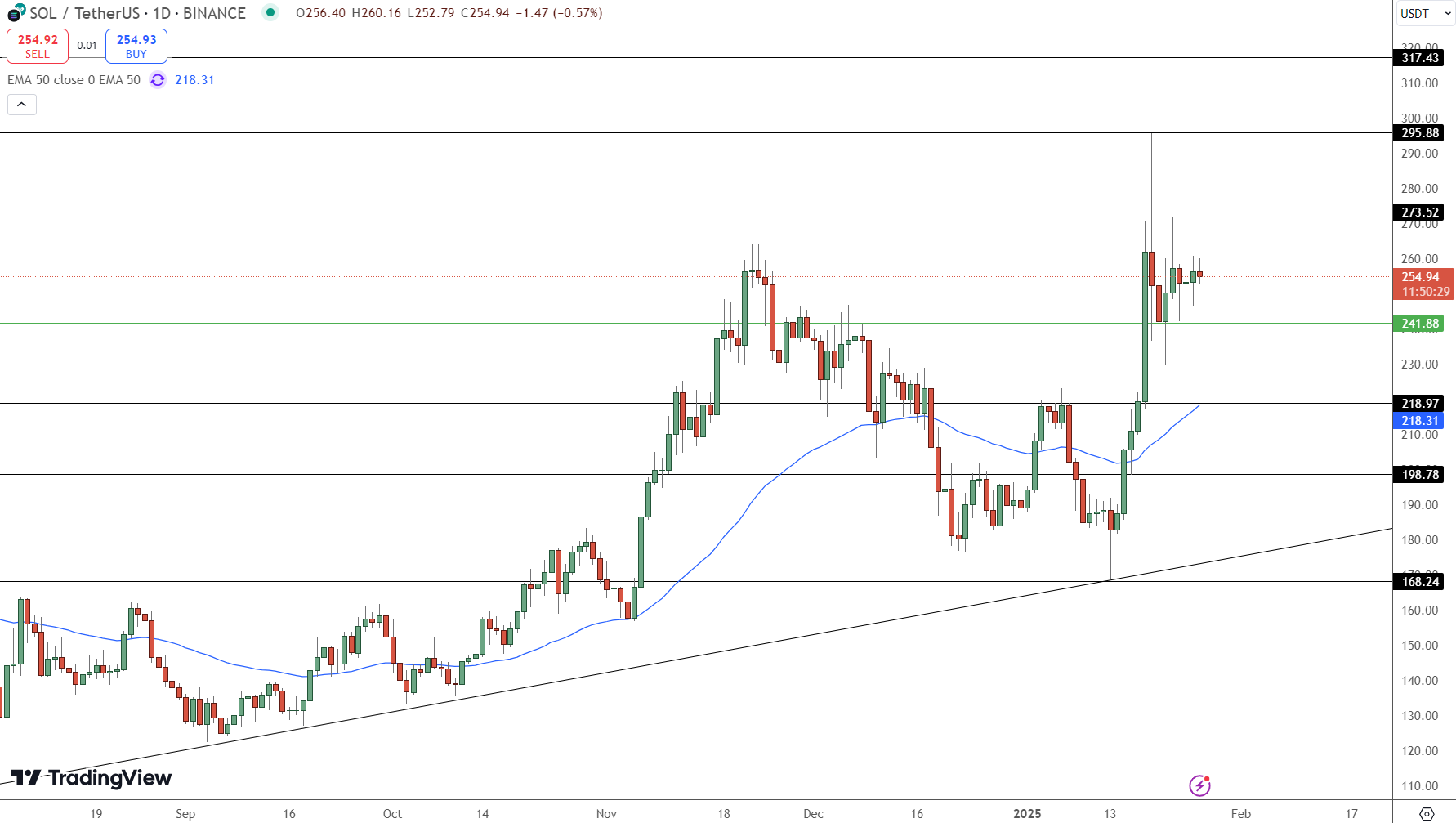 On the downside, immediate support lies at $241.88, with further levels at $218.97, which coincides with the 50-day EMA, currently acting as dynamic support. A breach below this level could expose SOL to a decline toward $198.78.