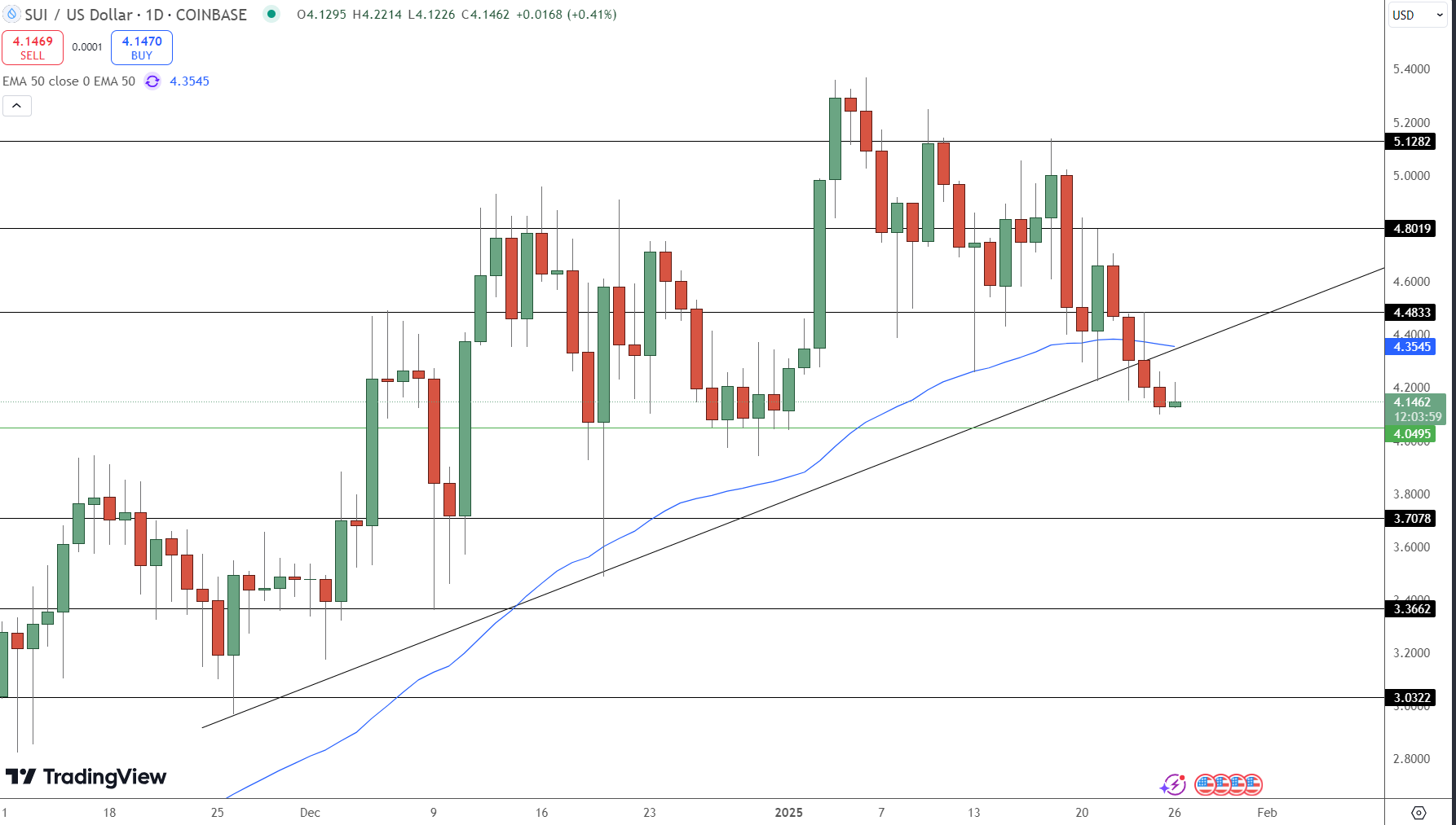 SUI is currently trading at $4.14, testing a critical support level at $4.05. A break below this level could expose the price to further downside, targeting $3.70 and potentially $3.36. On the upside, immediate resistance is seen at $4.48, with a stronger hurdle at $4.80, aligning with the 50-day EMA at $4.35, which could act as a dynamic resistance.