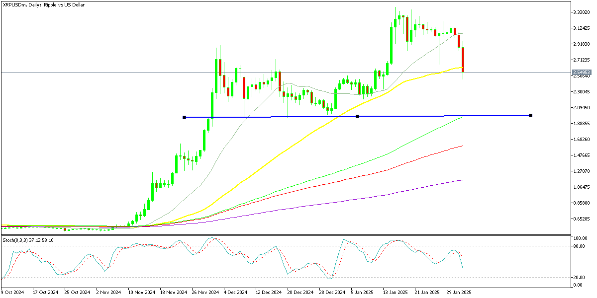 Cryptocurrencies have tumbled lower over the weekend due to US tariffs, with XRP dipping below $2.50, but there are signs of a bounce off the support, which comes around $2,50 for Ripple coin.