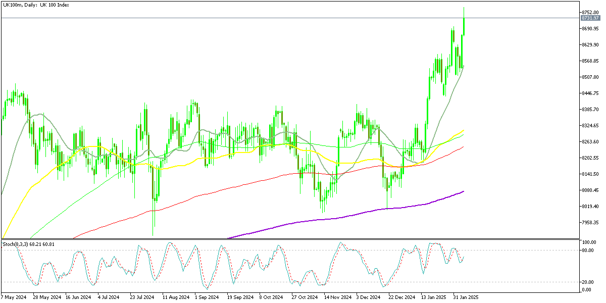 The FTSE 100 UK index was trading in a range for most of 2024, however moving averages were keeping the price supported on the daily chart. In January 2025 though, we saw a bullish breakout above the range, with the FTSE making a new record high at8,697 points. But, since last Thursday the UK 100 index has been showing some weakness, retreating lower as the White House applied tariffs on Canada and Mexico. However, the risk sentiment improved as tariffs were delayed and yesterday buyers returned, so the FTS surged higher.