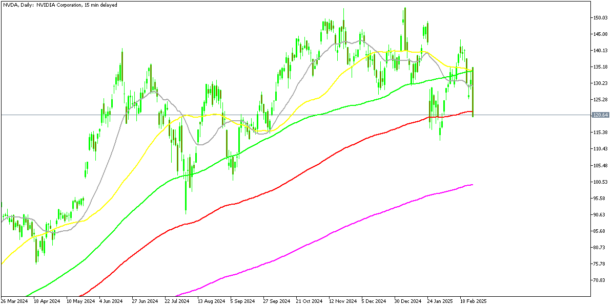 However, today marked a stark reversal for Nvidia, as its stock plummeted from $135 to $120, reflecting a loss of over 10%. The shares are currently trading below the critical 100-day moving average at $121, indicating a precarious technical position. This downturn was part of a broader trend, with all major U.S. market indices, particularly the Nasdaq composite, which fell by 2.8%. Nvidia’s stock specifically contributed to this decline as enthusiasm for AI technology appears to be diminishing.