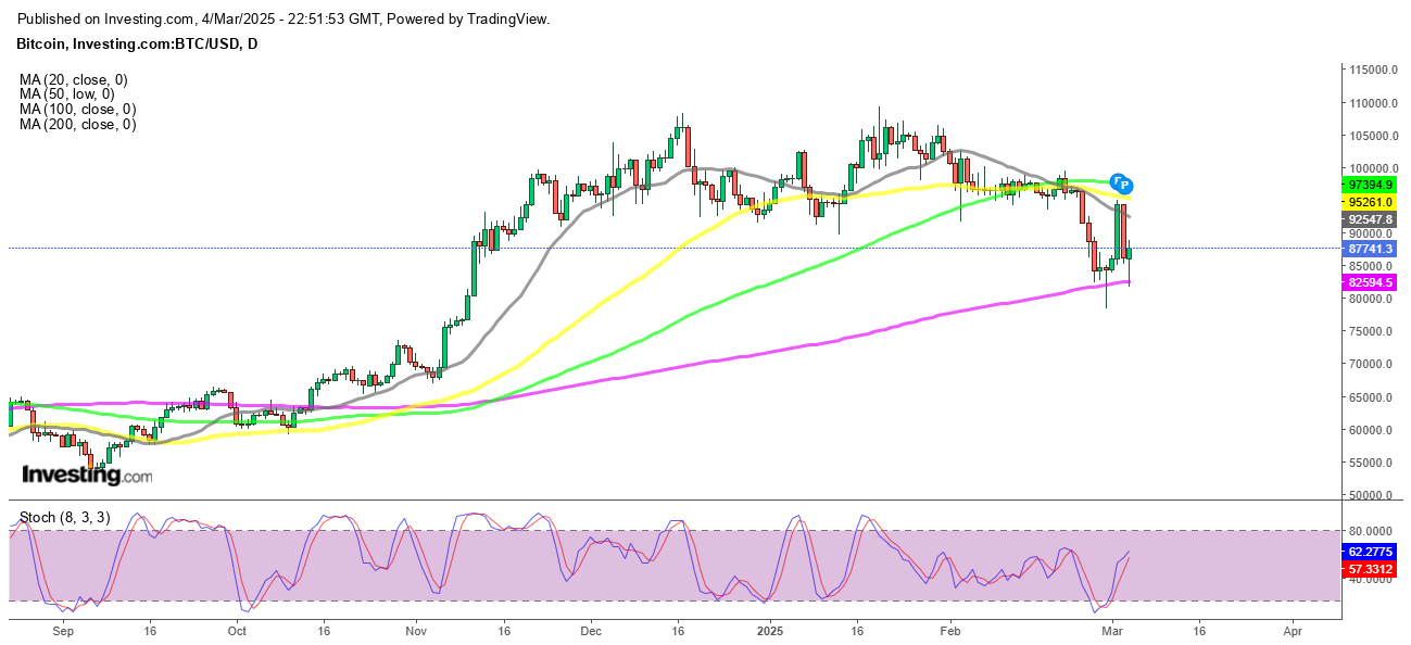 On Sunday, Bitcoin saw a strong bounce, finding support at the 200-day SMA (purple), which sent the price soaring to $95,000. However, sellers quickly regained control, and by yesterday, BTC/USD had dropped below $82,000, wiping out most of the gains from Trump’s strategic crypto reserve announcement.
