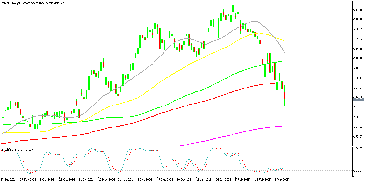 Amazon (AMZN) has seen increased volatility, falling nearly 20% from its early February peak. The stock opened with another bearish gap today, continuing its recent downtrend. A decisive break below the $200 level and the 100-day SMA (red) on the daily chart confirmed further bearish momentum, sending AMZN down another 4% to $192.40.