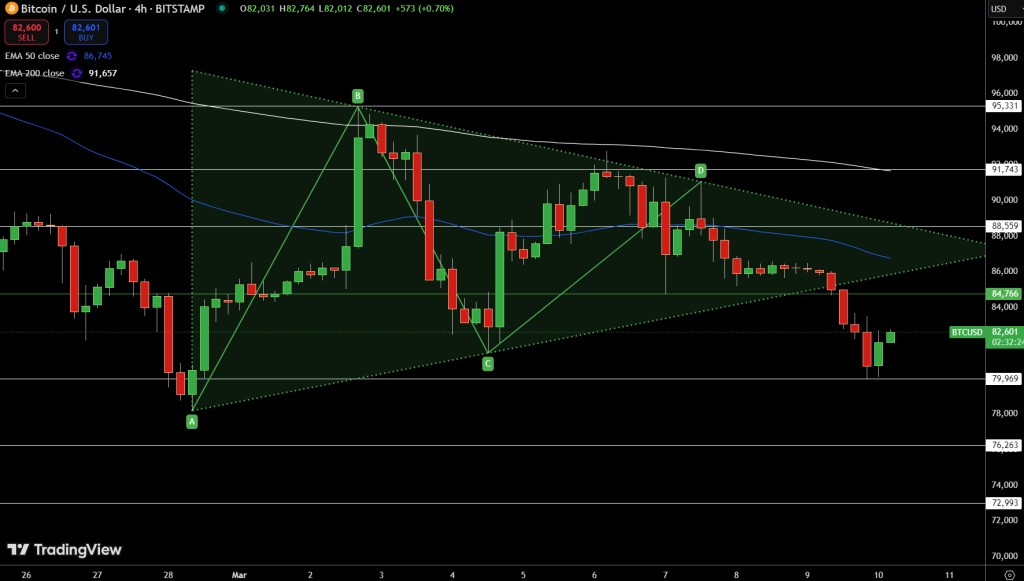 Bitcoin (BTC) has broken below a key symmetrical triangle pattern, confirming a bearish continuation. Currently trading at $82,601, BTC remains under pressure after failing to hold the $84,766 support level.