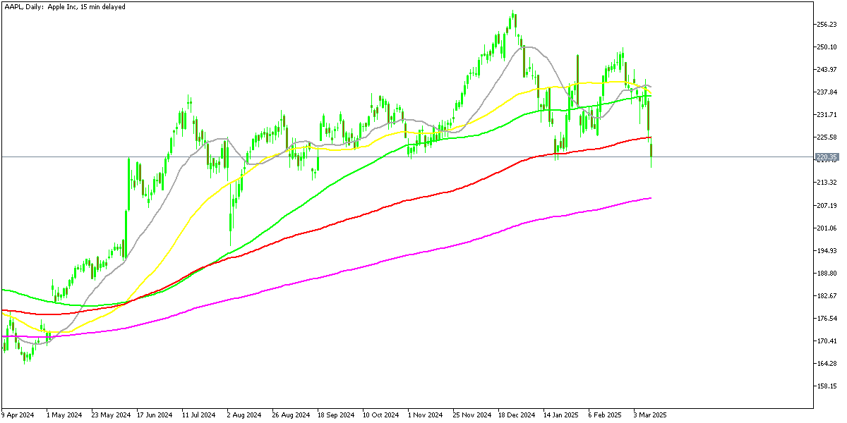 Apple’s stock, which had been in an uptrend for most of 2024, peaked in mid-December at $260 before entering a downtrend. Yesterday, it closed at $227.50, down 5% as part of a broader selloff.