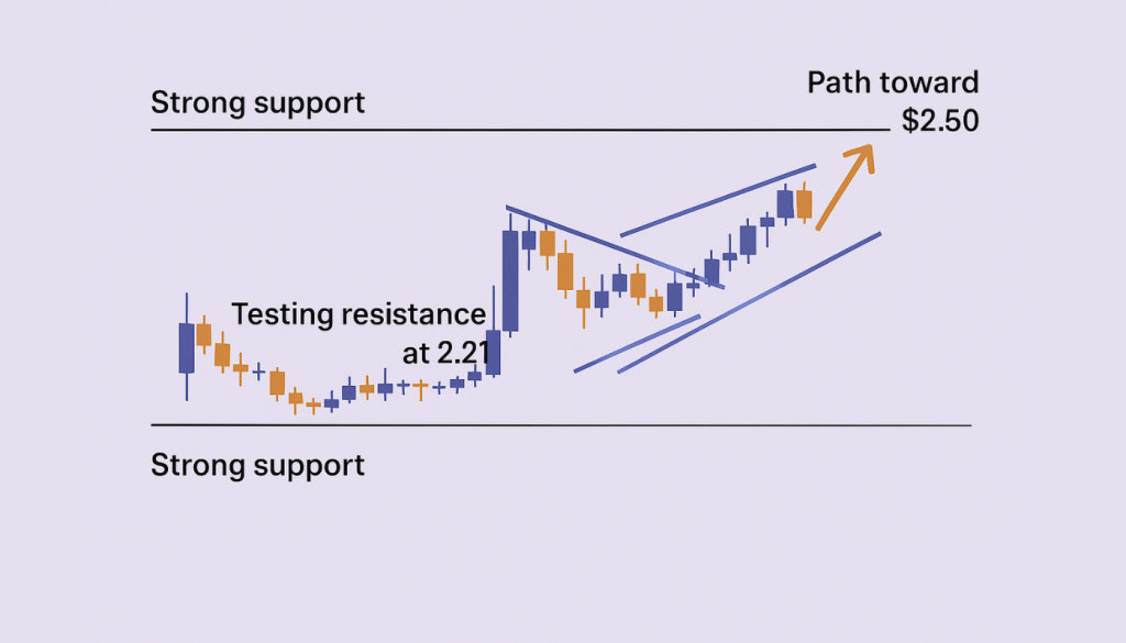 The appearance of a falling wedge breakout—a bullish reversal pattern—adds technical strength to the case for a rally. If XRP can hold above $2.14, the path toward $2.50 could open quickly. A close above $2.21 would further validate this move.