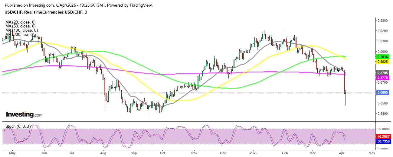 In currency markets, USD/CHF has been notably volatile due to shifting global risk sentiment. The dollar initially strengthened, pushing the pair above 0.8850 early in the week. However, resistance at the 100-day moving average halted further gains, and USD/CHF dropped around 3 cents as broader markets turned risk-averse.