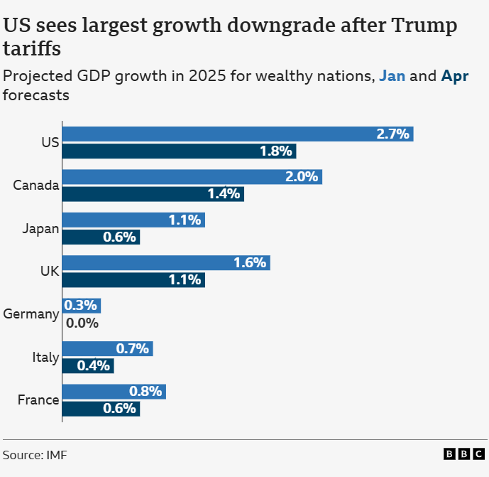 While several countries are slowing down, the US cut is the biggest. The IMF points to a mix of rising policy uncertainty, falling consumer confidence and the risk of tariffs backfiring. Businesses are being squeezed by higher input costs and supply chain disruption and consumers are pulling back.