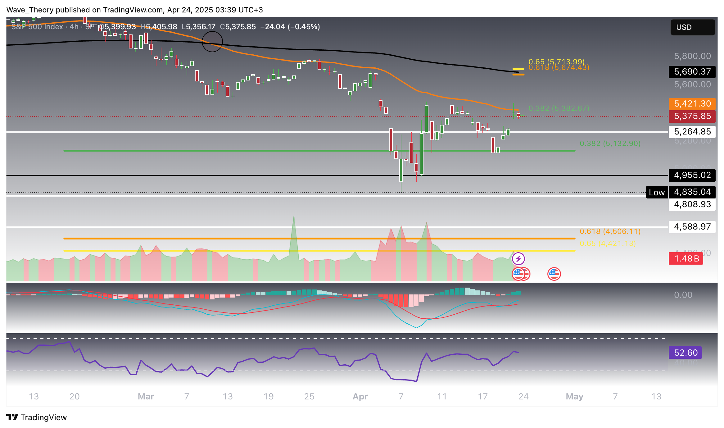 The S&P 500 (SPX) is currently testing critical resistance at the 50-period EMA on the 4-hour chart, located at 5,421. A decisive breakout above this level could open the door to the next major resistance area: the 200-period 4H EMA, which aligns with the Golden Ratio (0.618 Fibonacci level) around 5,714.