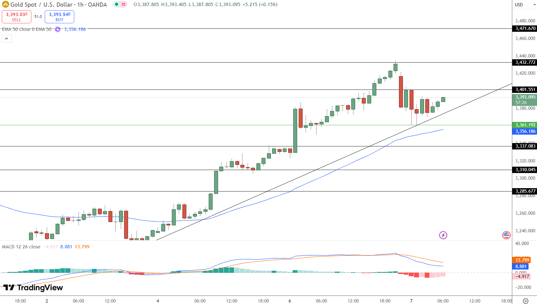 Gold is at $3,393 just above a critical trendline and the 50 period EMA at $3,356. Resistance is at $3,401 with a possible move to $3,432 if this level is broken. But the MACD is showing early signs of a bearish crossover so the momentum may be cooling.