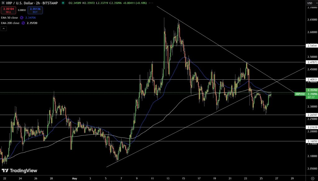 XRP/USD is currently at $2.35 with a 24 hour volume of $2.15 billion. The 2 hour chart is bouncing from $2.27 support but resistance is near $2.41. The MACD is hinting at a bullish crossover but confirmation is lacking.