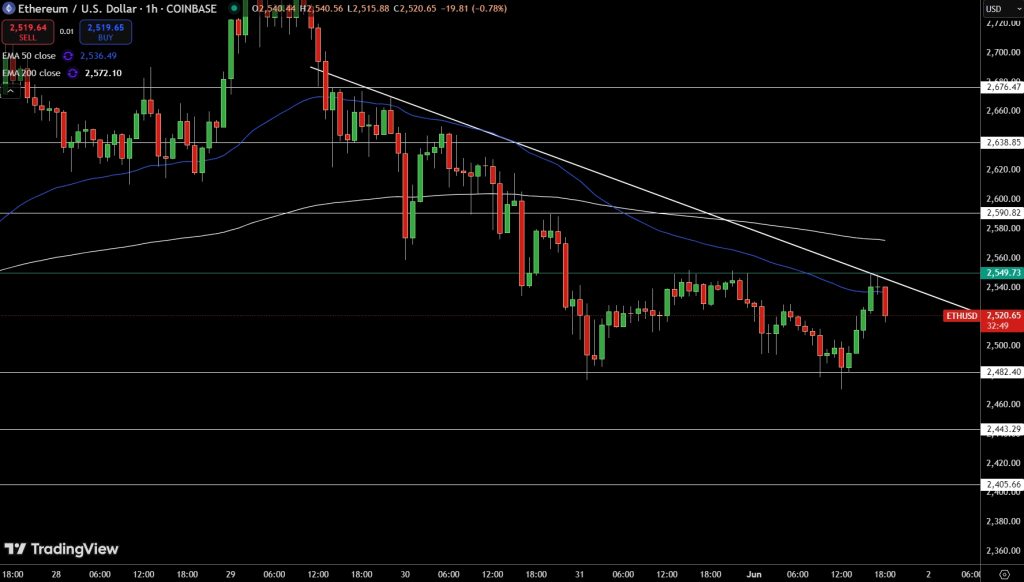 Ethereum ETH/USD is at a critical zone, trading at $2,518.94, down 0.79% in the last 24 hours. The 1-hour chart shows a struggle against the downward trendline at $2,549.73, backed by the 50-period EMA at $2,536 and the 200-period EMA at $2,572. This confluence of resistance is bearish.