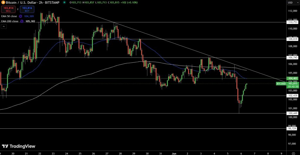 From a technical perspective, Bitcoin BTC/USD is bouncing from $102,439 support and is currently at $103,800. The bounce has formed higher lows and a bullish engulfing pattern on the charts – both good signs of buying interest.