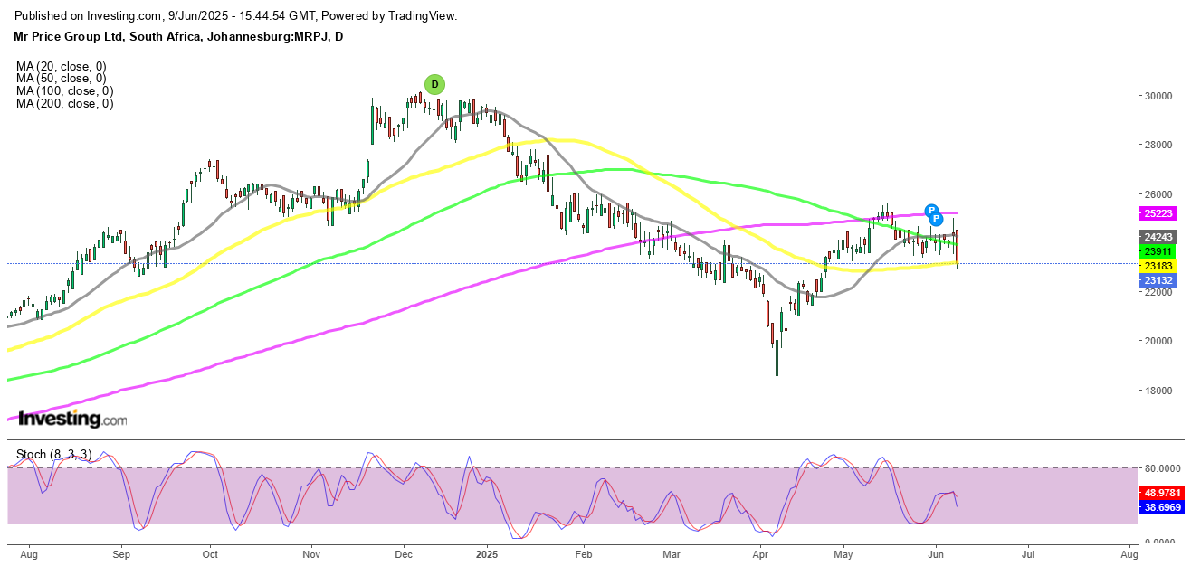 However, the upbeat financial report failed to inject new enthusiasm into the market. While Mr Price’s share price edged higher to 25,000.00 ZAC following the release, it soon met stiff resistance at the 200-day simple moving average (SMA), a historically significant barrier.