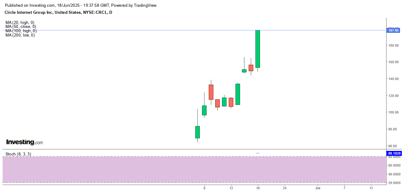 By Monday morning, momentum had only grown. Circle opened the session at $147 and soared another 28% during the day, reaching an intraday high of $196.50 and pushing weekly gains to 45%. The move was driven by overwhelming retail and institutional interest amid the newfound regulatory clarity.