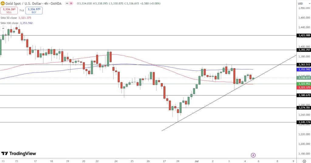 Gold (XAU/USD) ended last week flat, trading near $3,336, as markets digested a string of economic reports and awaited major catalysts ahead. While the U.S. jobs report offered mixed signals, gold’s price action has remained tightly coiled, hovering above a critical support zone at $3,323.