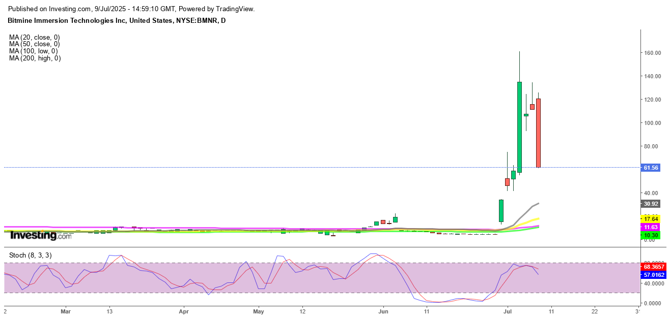 BitMine Immersion Technologies (NYSE American: BMNR) saw one of the most dramatic stock swings in recent memory, crashing nearly 50% in a single session as profit-taking wiped out much of last week’s extraordinary gains. After skyrocketing from $4 to $161 on Thursday and closing the week at $135, BMNR opened today above $120 but quickly nosedived to under $60.