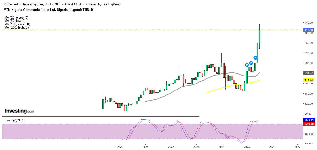 MTN Nigeria’s stock continues to defy gravity, hitting record highs on investor optimism and rapid telecom expansion.
